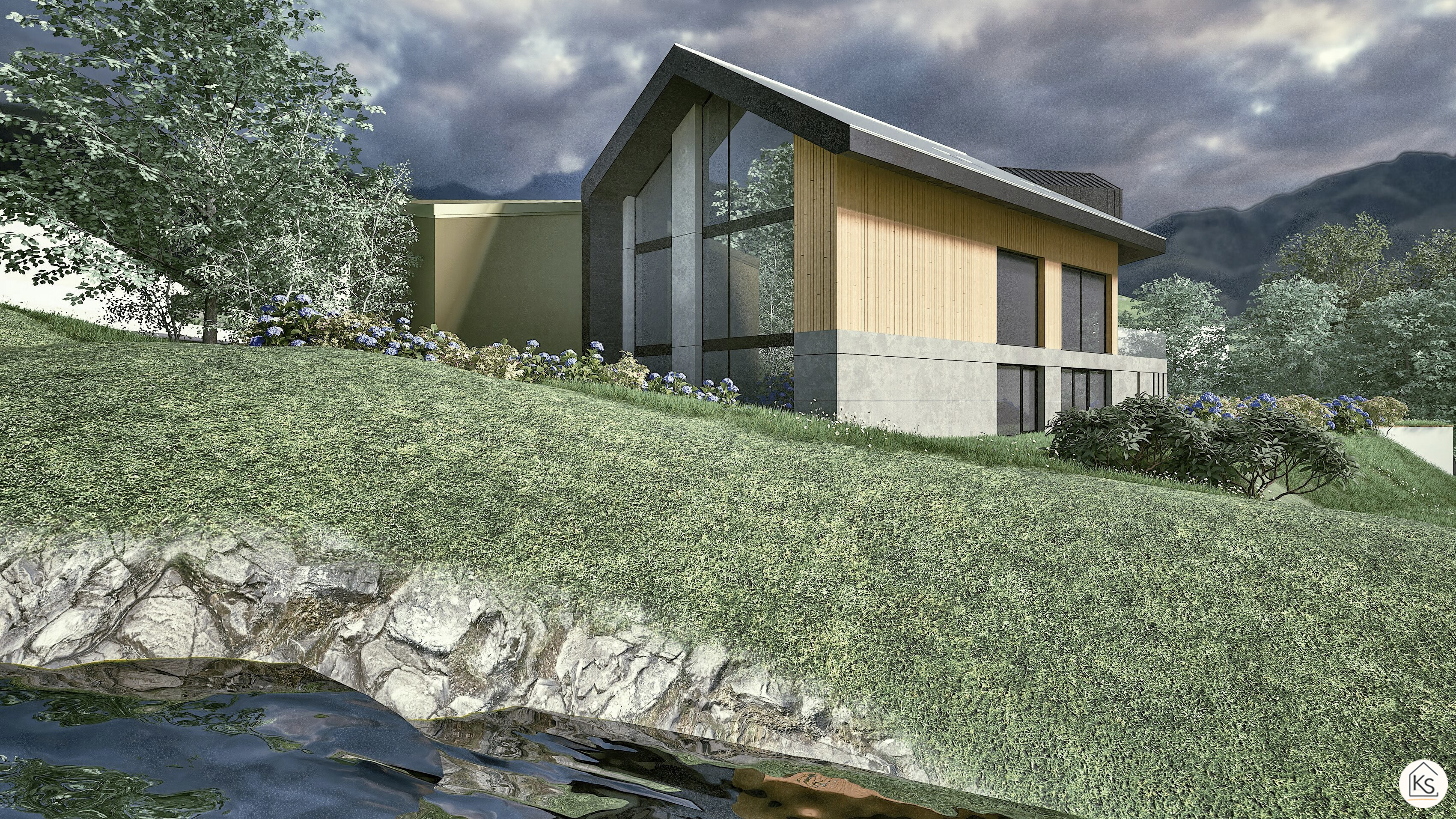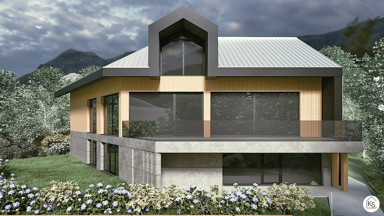 Swoim projektem w Akademii wybrałam celowo bardzo trudny przypadek: duży dom z reprezentacyjnym widokiem na jezioro i góry, otwarty przeszklonymi elewacjami w kierunku północno-zachodnim, na wymagającej działce o dużym spadku terenu.