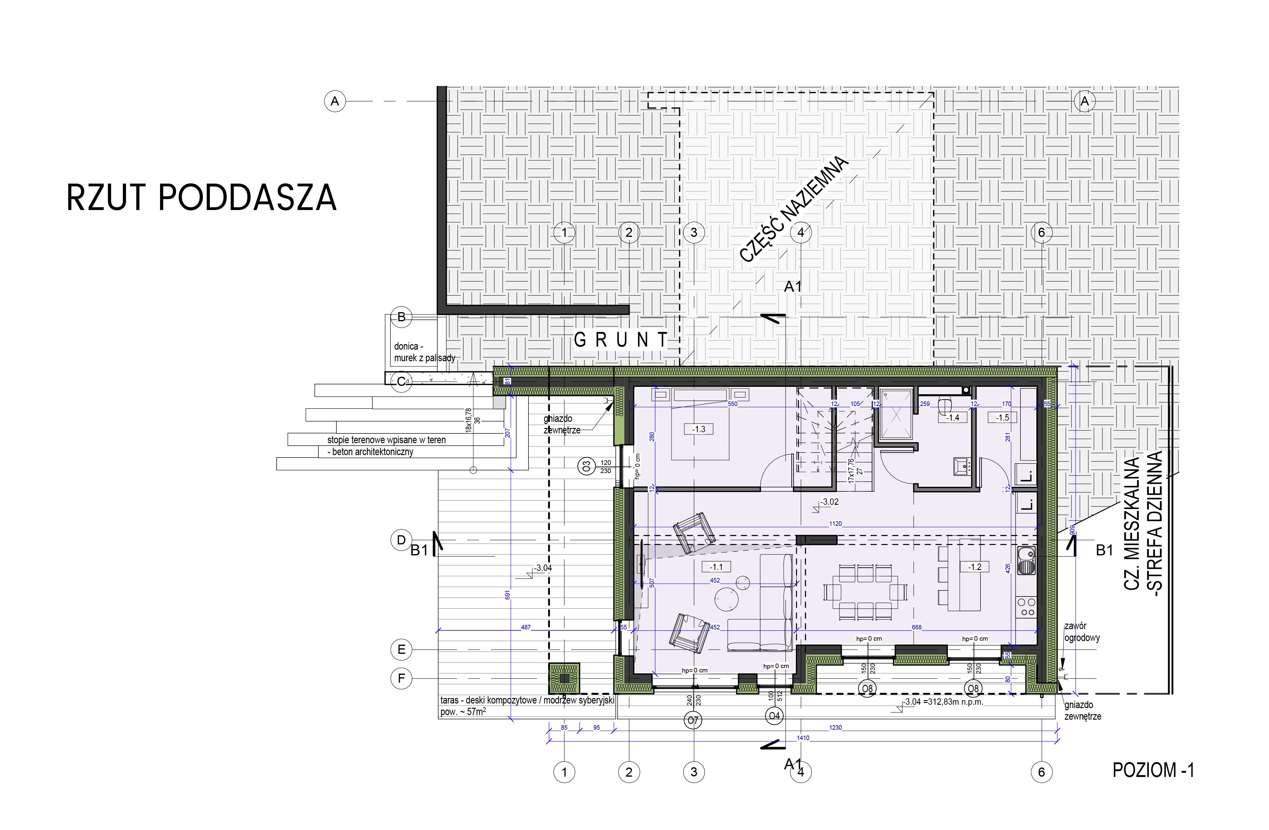 - strefa dzienna „wkopana” niżej, otwarta na ogród,